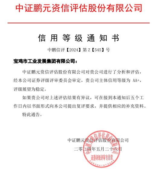 近日,宝鸡市工业发展集团有限公司成功获得国内权威评级机构中证鹏元...