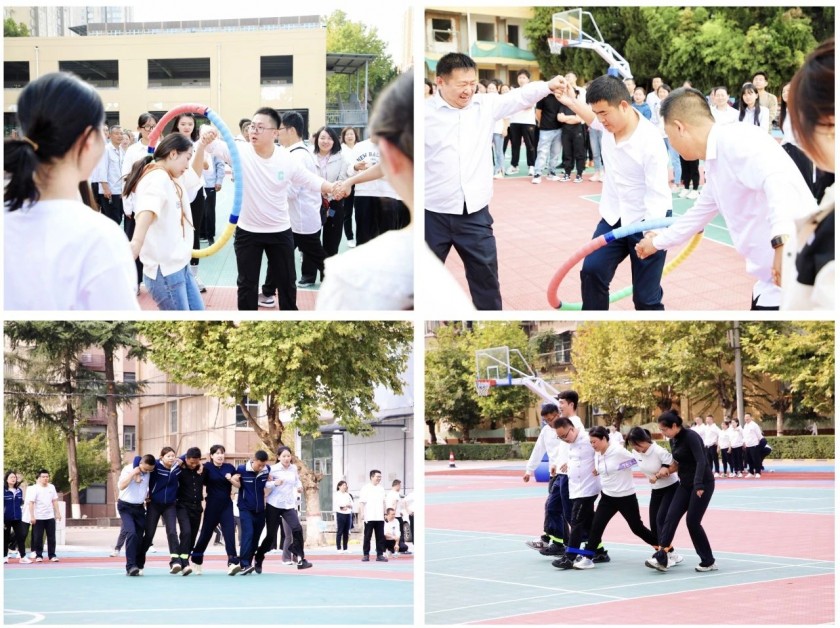 2、两人三足、一圈到底 在“两人三足”和“一圈到底”的趣味项目中,合力与默契成为致胜的关键。运动员们健步齐飞,同向而动,脚下的绳子和身上的圆环不再是束缚,而是彼此间深深的信任与担当。他们用行动诠释了“团结就是力量”的真谛。