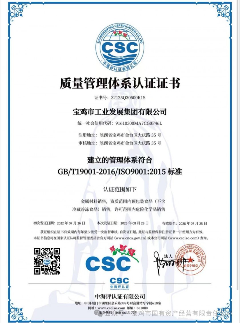 宝鸡市工业发展集团有限公司顺利通过ISO 9001认证审核 |