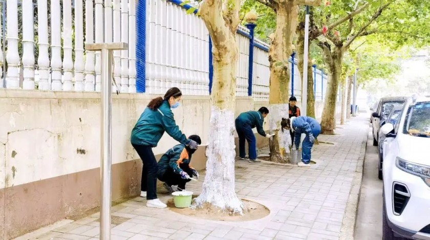 二、热电项目:树木刷白,防虫护绿 随着冬季的脚步,气温逐渐下降,热电项目抢抓晴好天气,陆续对辖区所有树木开展刷白工作,为树木披上一层崭新的“保暖衣”。树木刷白现场,工作人员齐心协力,配合默契,带着桶、石灰、刷子等工具对已修剪完毕的树木进行涂刷,重点对树皮缝隙、洞孔、树杈等处统一高度,细致均匀涂抹。毛刷在大家手里上下左右移动,一棵棵树木在大家的齐动手中穿上了防虫杀菌的“防护服”,形成了一道别致的风景。